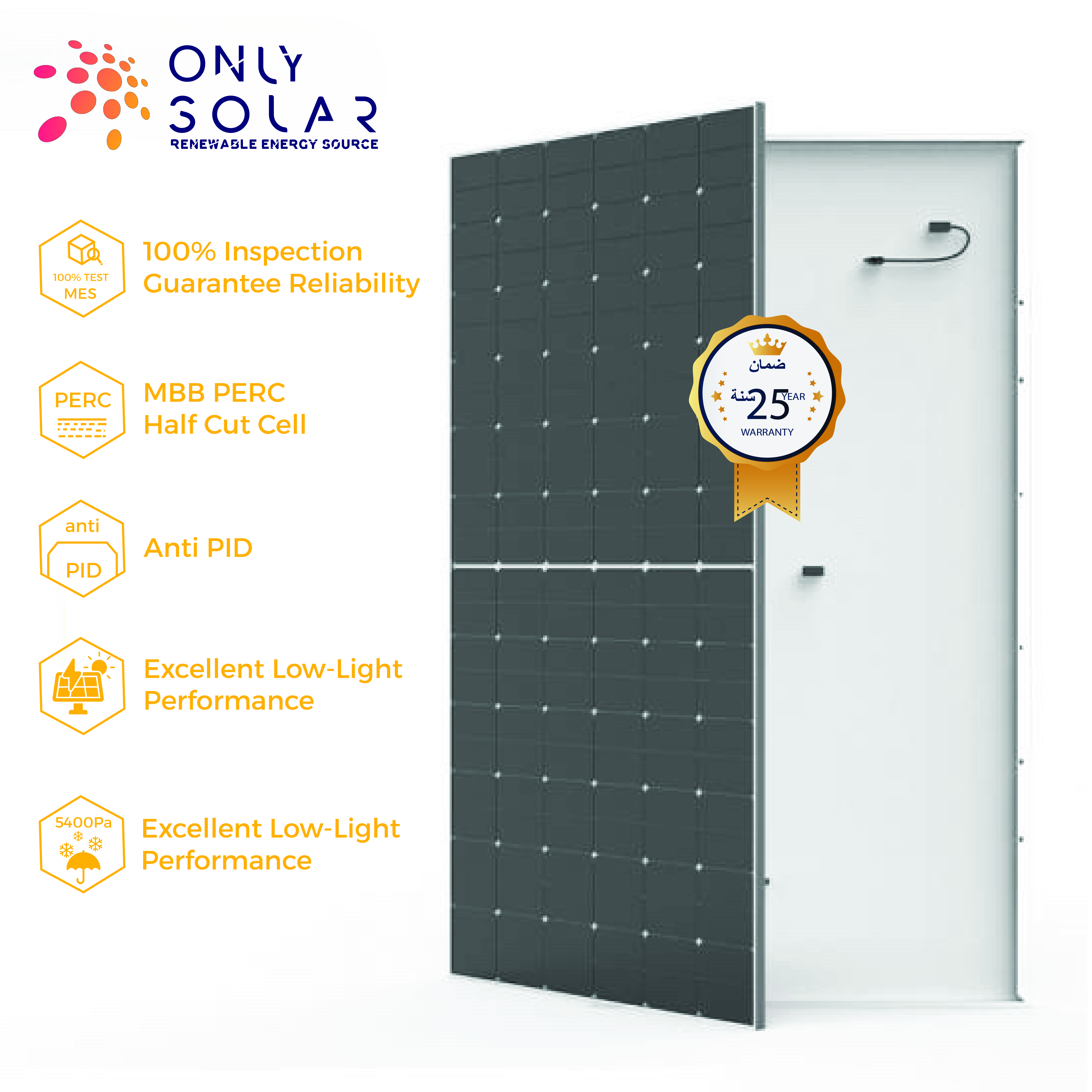 Price : 407.00 SAR / Inclusive of VATHalf-cell Technology is cutting One Cell into two, it will reduce thermal resistance, and improve output power by 5-10W; it could meet 1500V whole system voltage design demand, and reduce whole system cost by 10%. Compared to full solar cell modules, this cell sub fissure, power attenuation, and sunshine occlusion are lower; and have excellent high-temperature character. It is the best choice for large Solar Power Plants.